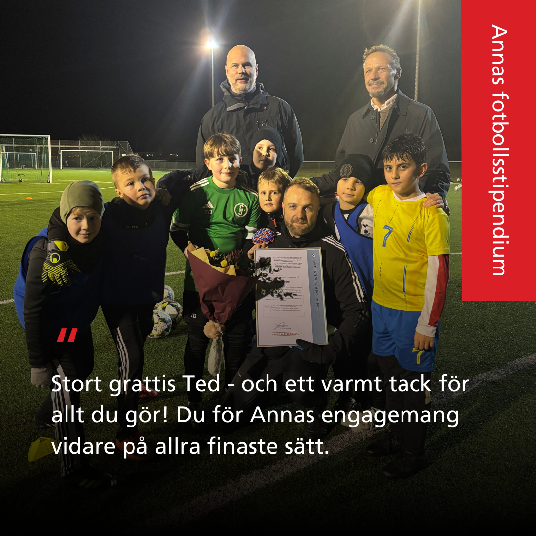 I år går stipendiet till Ted Durdel, som med sitt starka och intensiva engagemang i Smedby BoIKs ungdomsverksamhet gör ett fantastiskt arbete för unga spelare. Teds passion att skapa en trygg och inkluderande miljö för ungdomarna är precis den typ av insats som Anna själv alltid värdesatte.